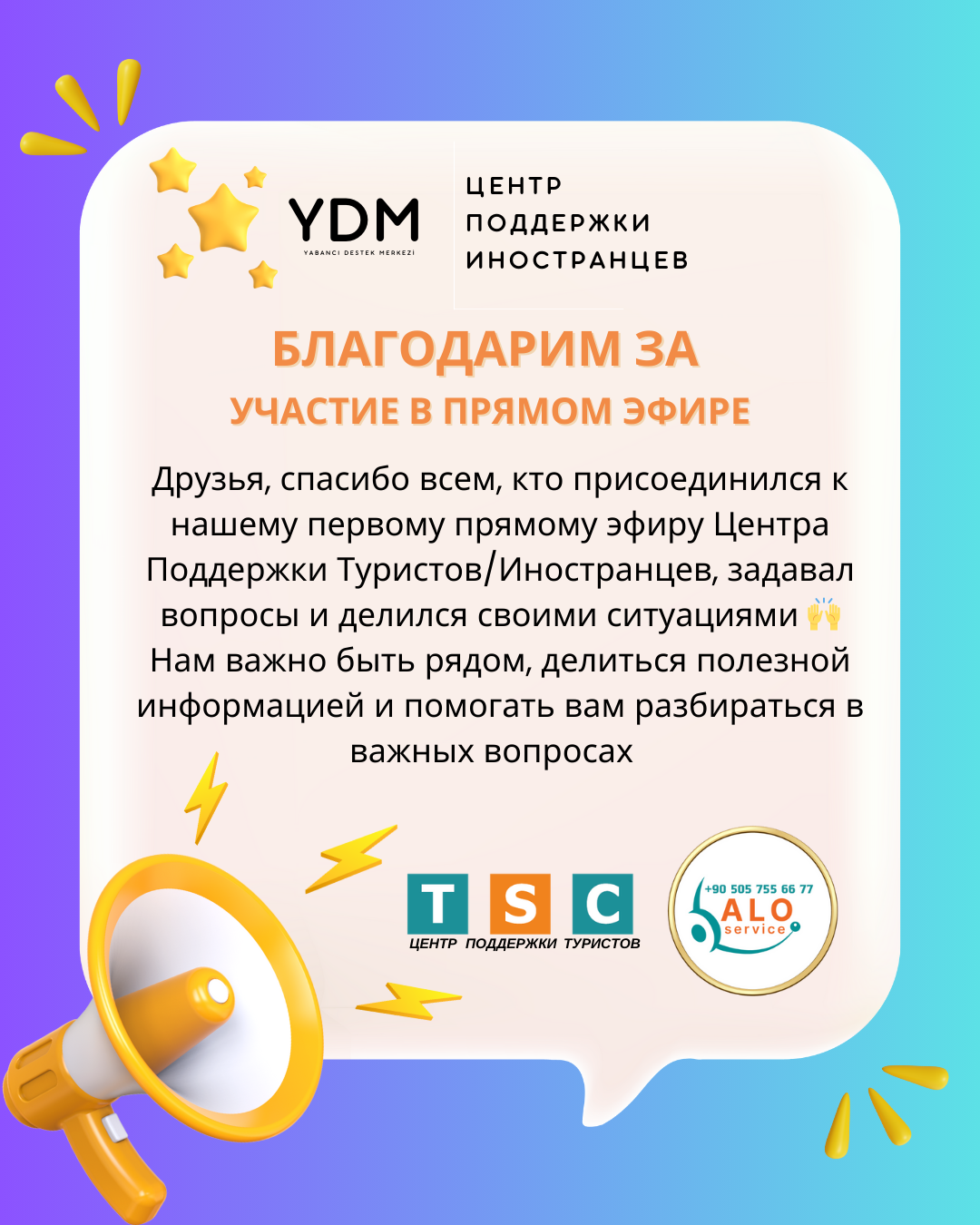 Друзья, спасибо всем, кто присоединился к нашему первому прямому эфиру Центра Поддержки Туристов/Иностранцев, задавал вопросы и делился своими ситуациями